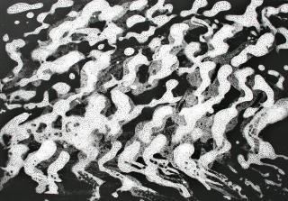 Vidar Utvik har f.eks. doneret 2 litografier til støtte-auktionen. Det ene af disse, som vises her, bærer titlen "Bevægelse", inspireret af vandets bevægelser fra en såkaldt hesterænde på stranden i Bønnerup.