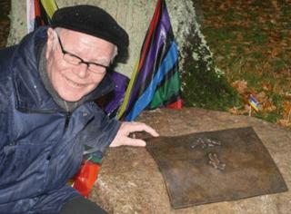 Henning Sørensen ved mindesten for oprettelsen af Danmarks første militærnægterlejr i 1918 i Grib Skov. På mindepladen ses hænder der knækker et gevær og en fredsdue.