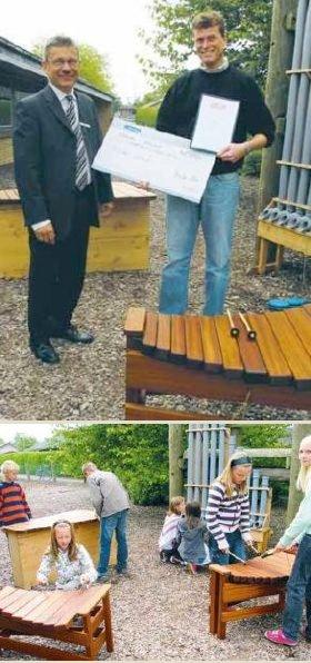 Forleden var områdechef i Realkredit Danmark, Torben Andersen, en smut forbi Voldby Skole for at overrække checken til skoleinspektør Henning Jessen. Til stede var endvidere manden bag de solide og vejrbestandige udendørs instrumenter, nemlig instrumentmager Finn Stubsgaard, der driver firmaet Lyd & Leg fra adressen Skippershovedvej 10 pr. Glesborg. Han kan også sagtens tillade sig at skrive lydkunstner på visitkortet, for der er vitterligt tale om velklingende instrumenter, der er lige til at spille musik på - forudsat man har evner i den retning, forstås!