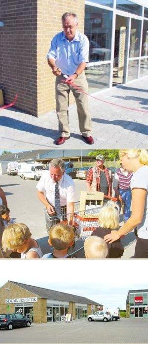 [billede øverst:] Den daværende borgmester i Nørre Djurs Kommune, Jens Peter Jellesen, klippede snoren til det nu 1 år gamle mini-butikscenter i Glesborg. [billede i midten:] Uddeleren i SuperBrugsen i Glesborg, Per Pedersen, delte slik ud på indvielsesdagen sidste år. [billede nederst:] Butikscentret mellem SuperBrugsen og Fakta i Glesborg kan fejre 1 års fødselsdag i disse dage.