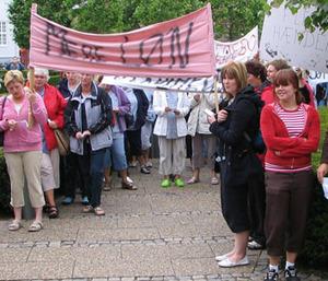 Det strejkende plejepersonale ønsker blandt andet 50 kroner mere i timen, bedre betaling for søn- og helligdage, og en fastholdelsesløn på 8000 kroner pr. år. Efter mødet på rådhuset fortsatte flokken til Kino i Grenaa, hvor de holdt fagligt møde om situationen.
