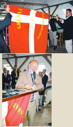 [billede nederst] Borgmester Torben Jensen fik æren af at slå det første søm i fugleskydningsselskabets nye fane. [billede øverst] Fanebærer Henrik Lassen ses her med Grenaa Fugleskydningselskabs nye fane i forbindelse med selskabets 100 års jubilæumsreception på Kalkgården i Grenaa.
