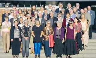 37 1967-studenter og to lærere fra dengang samlet til 40 års jubilæumsfest på Grenaa Gymnasium på en solbeskinnet septemberdag. (Foto: Fotograf Hans Mogensen, Grenaa).