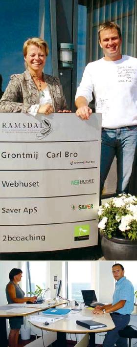 [billede øverst] Driftsleder Klaus Helweg og ingeniør Lene Rusholt udenfor Erhvervshuset. [billede nederst] Afdelingschef Palle L. Mikkelsen og ingeniør Anne M. Svane på det nye kontor.
