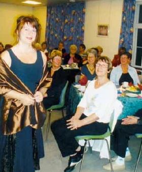 Der var tale om et på alle måder vellykket arrangement med fuldt hus, god stemning og en masse flotte gevinster. Fire friske damer fra lokal-området viste et bredt udsnit af efterårets og vinterens tøj-mode - det være sig både til hverdag og fest. På herstående foto er vi vist ovre i den sidstnævnte kategori af tøj.