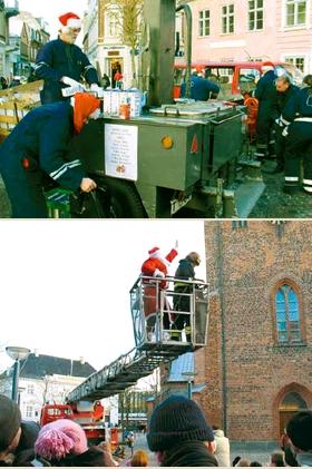 De to herstående arkiv-fotos beskriver egentligt meget præcist, hvad der kommer til at ske: Dels sørger en stigevogn fra Grenaa Brandvæsen for at hente julemanden ned fra kirketårnet (og mon ikke han igen i år har lidt godter med ned til børnene), og dels kommer Beredskabsforbundet og sørger for gratis risengrød til alle. Beredskabsgården i Grenaa gør med andre ord påny en indsats for den gode julestemning i Grenaa. Der er naturligvis søndags-åbent i butikkerne i Grenaa Centrum, så man kan kombinere de to jule-happenings med det at få købt lidt ind til juletræet derhjemme. Til den tid er der jo kun en uges tid til juleaften!! Butikkerne har åbent fra kl. 11.00 til 16.00 denne søndag den 16. december. Den følgende søndag - den 23. december (altså Lillejuleaftensdag) har butikkerne i Handelscenter Grenaa også ekstraordinært jule-åbent, og her kommer den lokale harmonika-duo Mona & Gunnar og underholder.