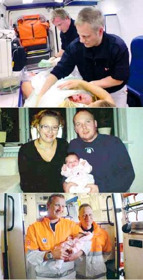 [øverst] Faderen, Allan Hjortshøj Jacobsen, tog dette billede lige efter, at hans hustru, Rikke Bendtsen Jacobsen, havde født en pige. De to Falck-reddere, der var fødselshjælpere, er Martin Oettel og Michael Bech. [midten] På bryllupsnatten blev Rikke Bendtsen Jacobsen og Allan Hjortshøj Jacobsen forældre til denne lille pige, som skal hedde Isabella. Her ses de i hjemmet i Ålsø. [nederst] Her ses de glade reddere med den lille pige, de hjalp til verden.