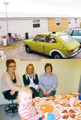 [øverst] »Gæste-Huset« ligger lige overfor Børnehaven Landsbyen, og forsøget blev skudt i gang i uge 5. Indtil videre er tilbagemeldningerne fra både medarbejdere og forældre positive. [nederst] Mette Sørensen, Christina Nielsen og Else Jørgensen er gæstedagplejere under samme tag i et hus i flygtningelandsbyen på Robstrup Mark ved Grenaa. I forgrunden ses Clara, der var én af gæste-børnene på Åbent Hus-dagen.
