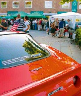 Amerikaner-biler - her ses noget af en Corvette - var der masser af ved Nytorv i Grenaa, hvor Jyske Bank blandt andet sørgede for hoppeborg til børnene, mens Grenaa Slagtehus/Grenaa Slagterbutik grillede barbeque ben og pølser til den store guldmedalje.