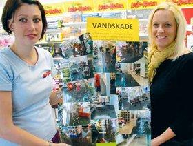 Legekæden har lavet denne foto-collage, der illustrerer, hvorfor man ikke har et gulvtæppe på lige for tiden. Det er Patricia McNally (t. v.) og indehaveren Henriette Lahn, der viser vandskade-collagen frem på billedet.