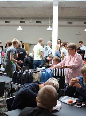 Kakao og brownies til alle elever og ansatte ved indvielse af den helt unikke kantine med det særlige gulv, meget mere dagslys end tidligere og med de nye møbler, som til dels er fremstillet af eleverne. (Foto: Haakon R. Petersen)