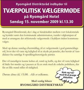 Ryomgård Distriktsråd indbyder til »Tværpolitisk Vælgermøde« på Ryomgård Hotel - søndag den 15. november kl.13.30