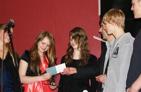 Fem stolte elever fra Ørum Skole modtager prisen for bedste film og et gavekort til biografen, så alle fem sammen kan få sig en tur ind at se en film, der måske, msåke ikke, kan måle sig med deres. (Foto: Haakon R. Petersen)