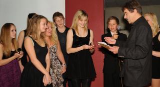 Gruppen, der vandt prisen for bedste film, var overraskede over, at de vandt. De havde tippet, at filmen om radioværten på Radio ABC havde vundet. Selv havde de lavet en film om en kok. Her får de overrakt prisernes pris af Per Søjmark fra UU Djursland.