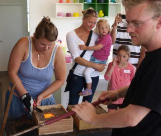 I værkstedet kan du hver tirsdag og onsdag i uge 29, 30 og 31 støbe dit eget lille ferieminde i glas. Medbring selv en form eller lav f.eks. et aftryk af din egen hånd i det våde sand. Der hældes varmt flydende glas i formen, og næste dag - når glasmassen er afkølet og størknet - kan den færdige figur afhentes og tages med hjem som et flot minde om glasbyen Ebeltoft.