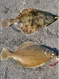 De to mest almindelige flade, der fanges ved de Danske moler er Skrubben (øverst) og Isingen (nederst).