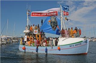 Med dækket besat af flygtninge anløber MS Anton Grenaa Lystbådehavn.