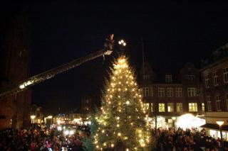 Selveste julemanden kommer og tænder Grenaa Bys store juletræ på Torvet.