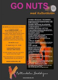 Lørdag den 17. marts 2012 vil Kulturskolen "Go Nuts". Det betyder at Norddjurs Kulturskole vil samle alle elever og lærere i Pavillonen, for at lave aktiviteter hele dagen. - Elever vil få tilbudt workshops, clinics og sessions og undervisning i musik, billedkunst, drama og dans. - Kulturskolens elever vil kunne tilmelde sig alle aktiviteter som kulturskolen ryster op med denne dag.