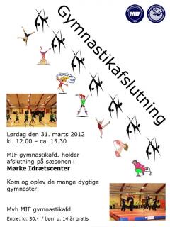 Gymnastikafdelingen i Mørke IF inviterer til Gymnastikafslutning, hvor mange hold vil vise, hvad de har lært i denne sæson. - På gulvet vil skiftevis være børnehold, MGP dans, Mini Mix, Rosenholm Mix (juniorhold - spring/rytme), zumba, combat, Blandet fitnes, Motion M/K. - Alle vil de vise hvad de har lavet i den forløbne sæson. I løbet af eftermiddagen vil der også være en overraskelse, som Rosenholm Mix leverer, der er altid spændende at se, hvad dé har fundet på.