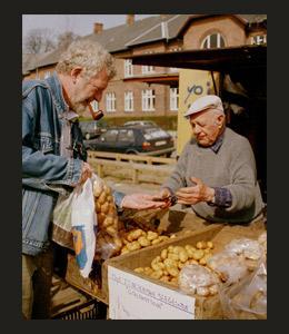 Nis Boesdal køber kartofler ved en torvestand.