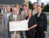 Vilhelm Jensen, Lions Club Gl. Estrup,overrækker den store check til Lis Nielsen fra støttegruppen, flankeret af unge Nille Thing. Bagved fra højre Knud Nielsen, Lions Club Skødstrup, gruppeleder Birgitte Østergaard Jensen, Rosa Fløjgaard og Jytte Steffensen fra støttegruppen.
