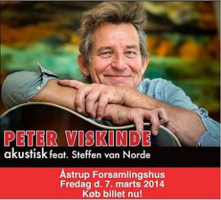 Peter Viskinde er manden bag to af dansk rockmusiks største succes´er. Ved solokoncerterne backes Peter Viskinde op af kollegaen fra bandet, Steffen van Norde. Det faste crew sørger for at lyd og lys giver en total oplevelse. Et setup, der giver den perfekte ramme for denne intime "tæt pÃ¥ sangene"-koncert. - Ã…strup Forsamlingshus sørger, som sædvanligt, for god mad før koncerten. - Glæd jer til en aften med dejlig mad og god underholdning.