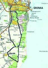 Sådan ser ruten til Grenaa Marathon 2004 ud. Den er 21,0975 km. lang, og skal således løbes igennem to gange af de 46 løbere, der vil løbe en hel-marathon.