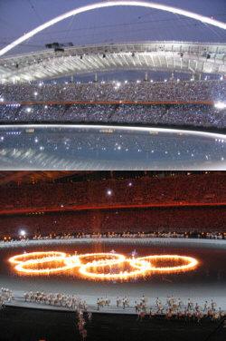 Selve åbningsceremonien var fantastisk. Midten af stadion var en stor sø, og der blev antændt 5 ringe. Der var en meget effektfuld scene med trommeslagere, efterfulgt af en dreng med et græsk flag, der sejlede over søen i en papirbåd. Symbolikken var, at grækerne er taget på havet, og at havet betyder meget for Grækenland.