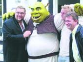 Grenaa Kino var i fredags blandt de premiere-biografer i landet, der kunne vise »Shrek 2«. Her ses filmens hovedperson sammen med hans danske stemme, Amin Jensen, og Jan Gintberg, der igen lægger stemme til det storskrydende og møgirriterende æsel, plus den danske dialog-instruktør Lars Thiesgaard.
