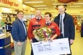 Vinderen af Grenaa Bladets »Årets Smil 2004«-konkurrence blev Annegrete Nielsen fra SuperBrugsen i Glesborg. Det udløste en Nordea-check på 5.000 kroner. Her ses den glade vinder sammen med Grenaa Bladets direktør og udgiver, Ole Skaanning Olesen (yderst t.v.), uddeleren i SuperBrugsen i Glesborg, Per Pedersen, og filialdirektør Bent Nørsten, Nordea i Grenaa.