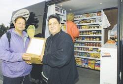 På billedet overrækker Dave Darlington en pakke med engelske specialiteter til James McNally.