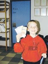 Emil Sørensen fra GIF Fodbolds miniput-drenge har fået Fairplay-prisen 2004. På billedet vifter han med den meget kontante præmie.