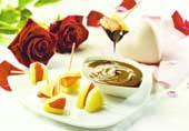 Chokolade-fondue er en flot og lækker afslutning på en hyggelig Valentins middag med levende lys og blomster på bordet.