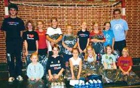 Pige Lilleput-spillerne fik ved mandagstræningen overrakt sportstasker, drikkedunke, vand og bolsjer fra Danske Bank (billedet).
