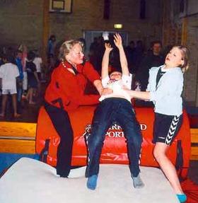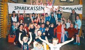 Multirullen, som Sparekassen Djursland er den glade giver af, er flittigt blevet benyttet af børnene hver torsdag, når de to hold med omkring 40 børn i Gjerrild-Bønnerup Idrætsforening har gjort gymnastik. På det ene billede ses foruden børnene også instruktørerne og afdelingsdirektør Mogens Adamsen fra Sparekassen Djursland i Grenaa.